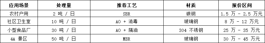 •微型設(shè)備(≤5 噸 / 日):適配農(nóng)家樂、獨棟辦公樓,采用 SBR 簡易工藝 + 碳鋼材質(zhì),報價集中在 1.5 萬 - 5 萬元,如 1 噸 / 日農(nóng)村戶用設(shè)備約 2 萬元;